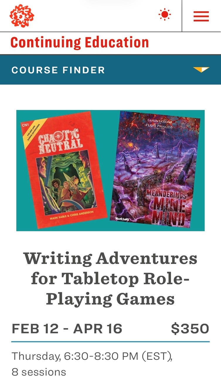 First, this Spring I’m teaching WRITING ADVENTURES FOR ROLEPLAYING GAMES, a continuing education class at the School of Visual Arts. It’s 6:30-8:30 PM on Zoom Thursdays from Feb 12 - Apr 16. In 8 classes, I’ll teach you how to write an adventure for roleplaying game, regardless of your level of experience (some of my students have never even played an RPG before).
